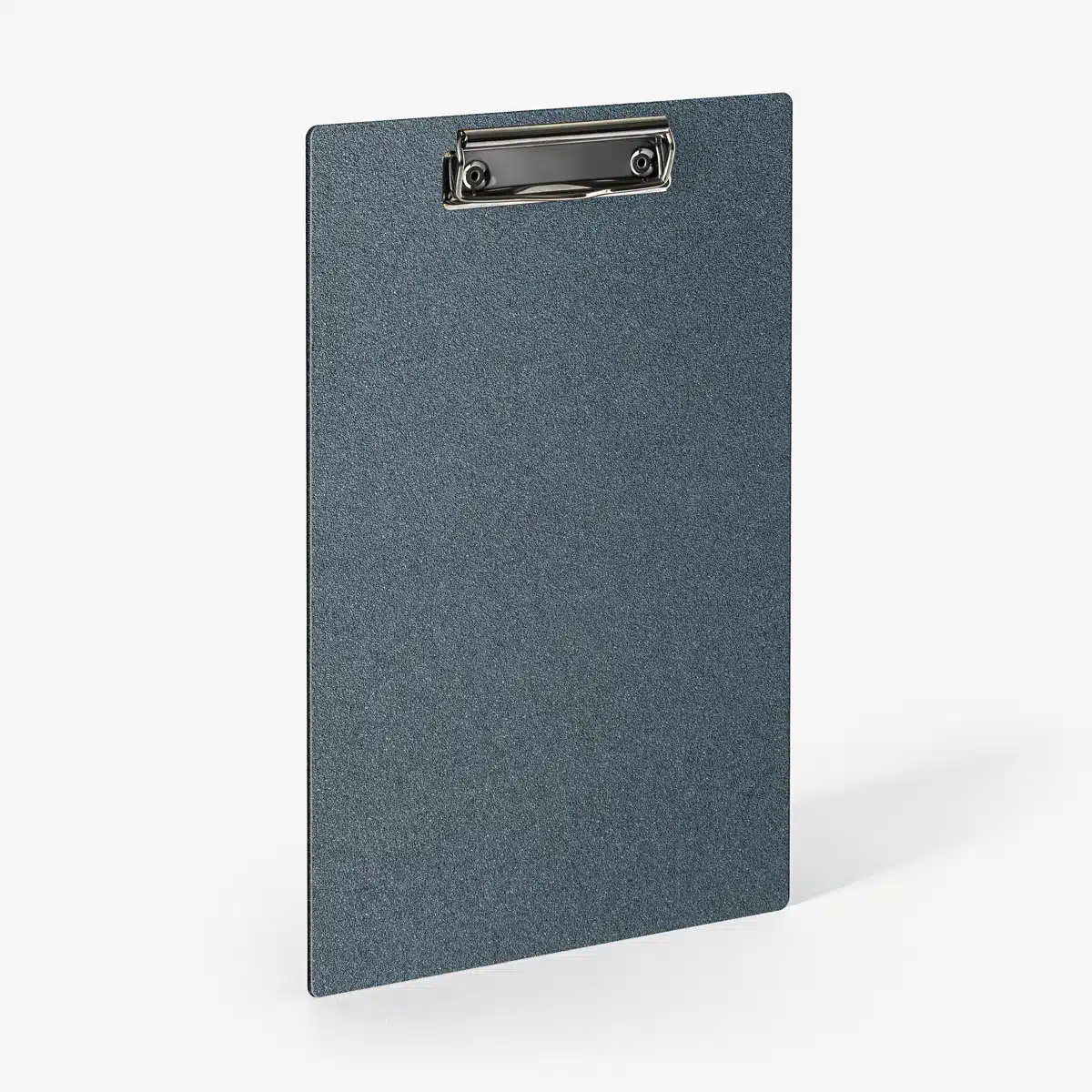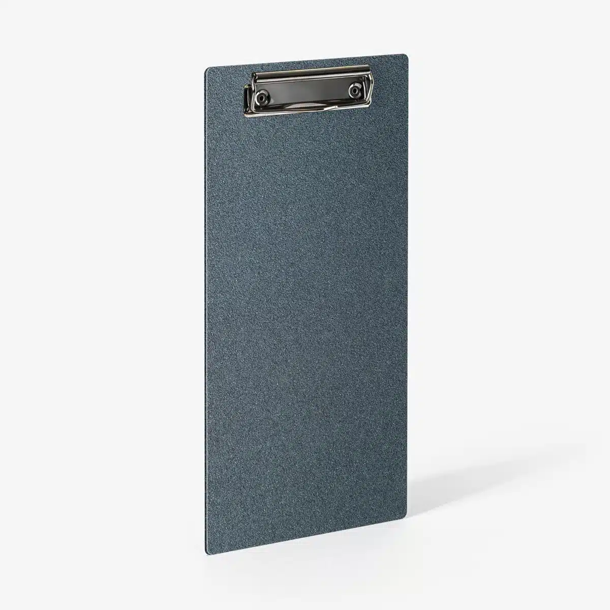 Le porte-menu Dedans en aluminium de 2 mm, thermolaqué couleur Azurite, disponible en trois formats avec système de fixation par pince métallique rivetée.