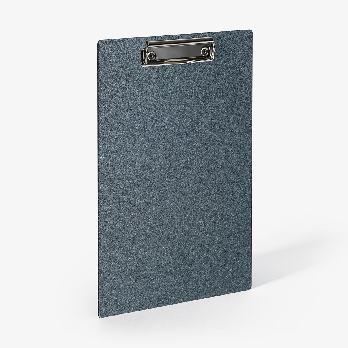 +iva /cadLe porte-menu Dedans en aluminium de 2 mm, thermolaqué couleur Azurite, disponible en trois formats avec système de fixation par pince métallique rivetée.
