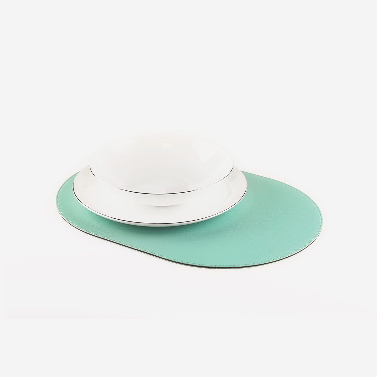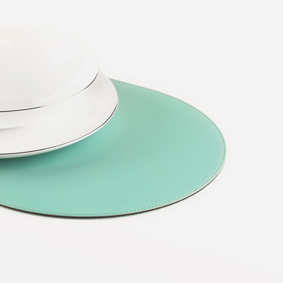+iva /cadSet de table cousu à la main aux formes arrondies, réalisé en Nautica couleur Smeralda, un similicuir étudié spécifiquement pour le secteur nautique avec gaufrage délicat effet cuir et âme en cuir régénéré.