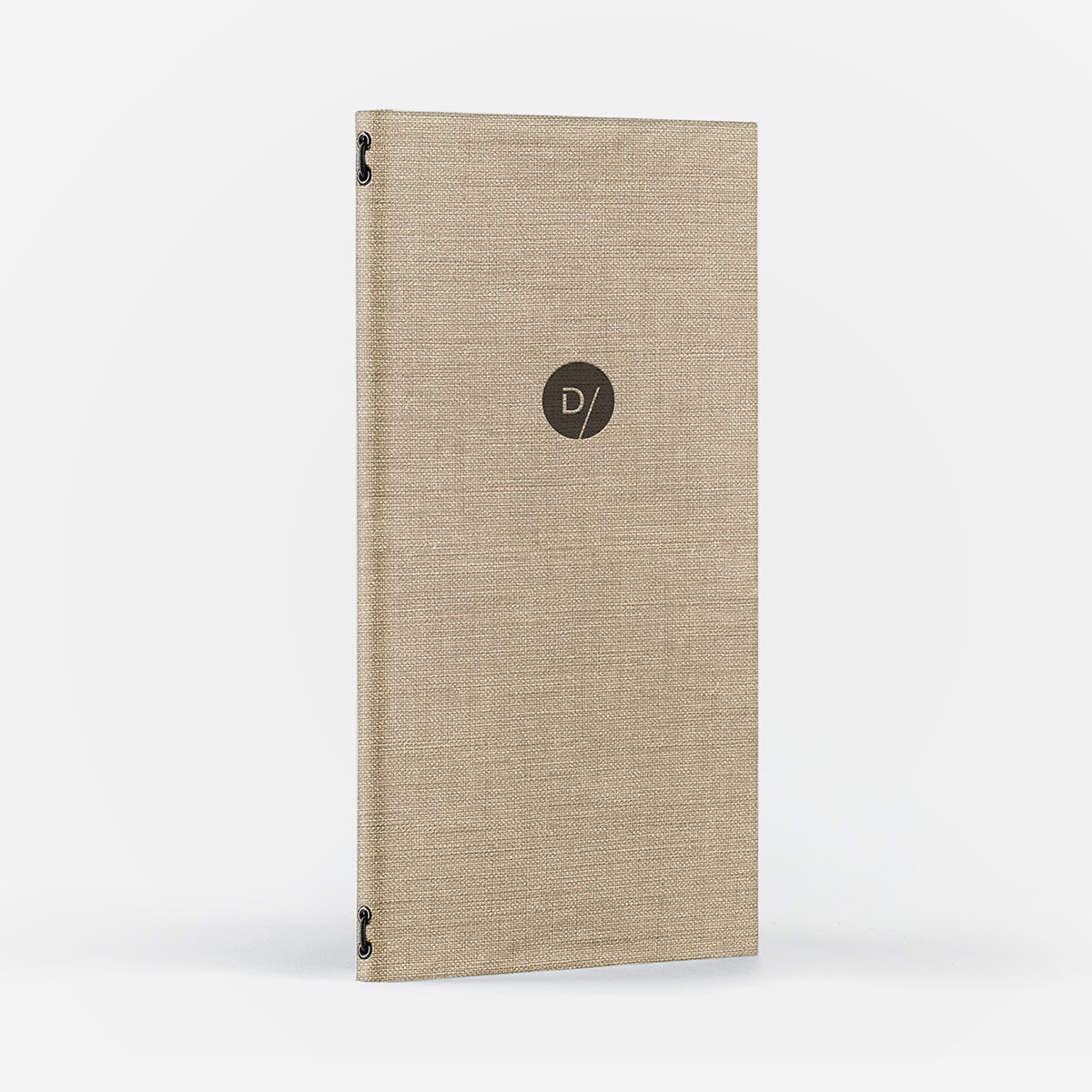 +iva /cadPorte-menu Canvas à couverture rigide bordée réalisé en Toile Lin Sable, une toile enduite à texture fine effet lin, résistante aux taches et à l’eau, en viscose certifiée FSC 100%.