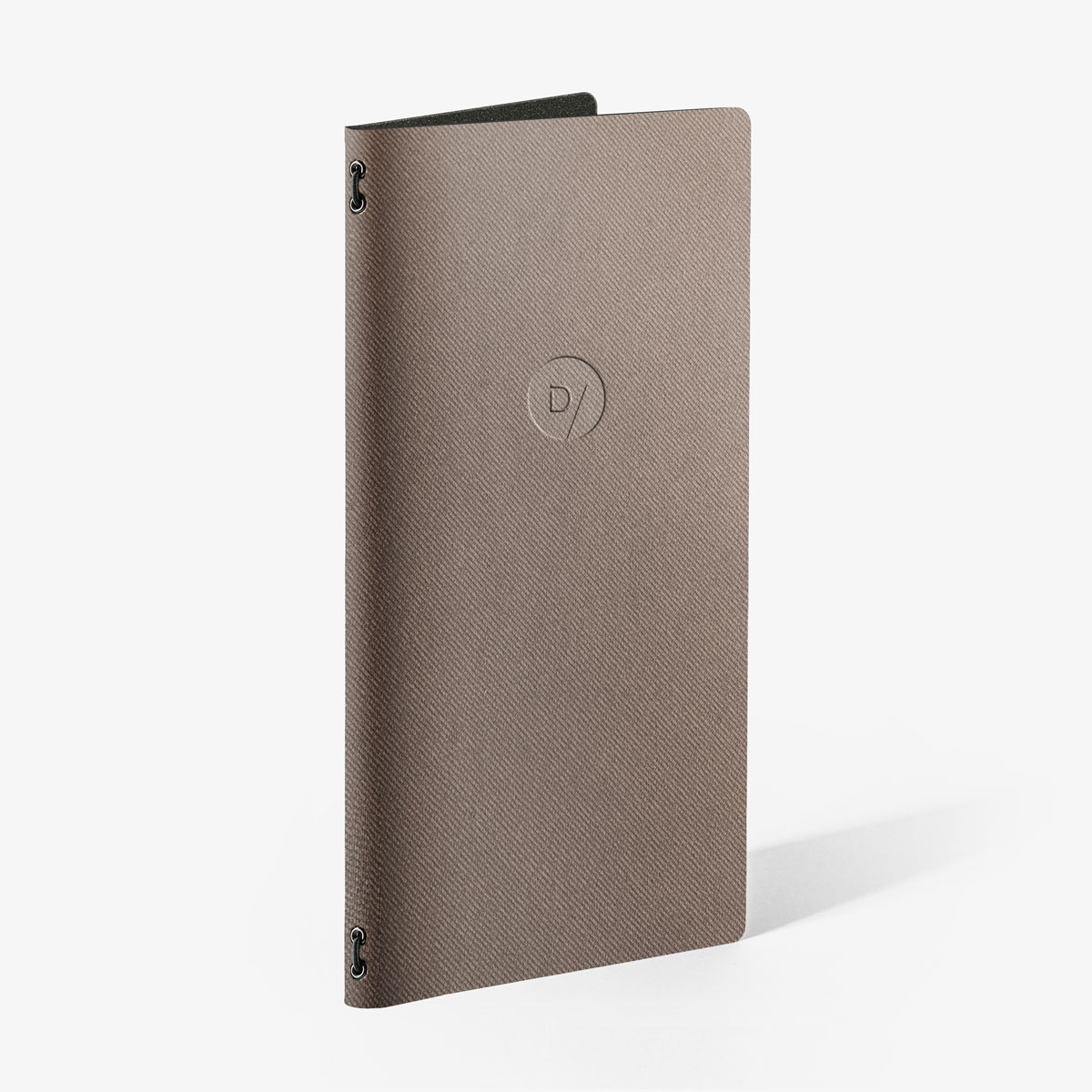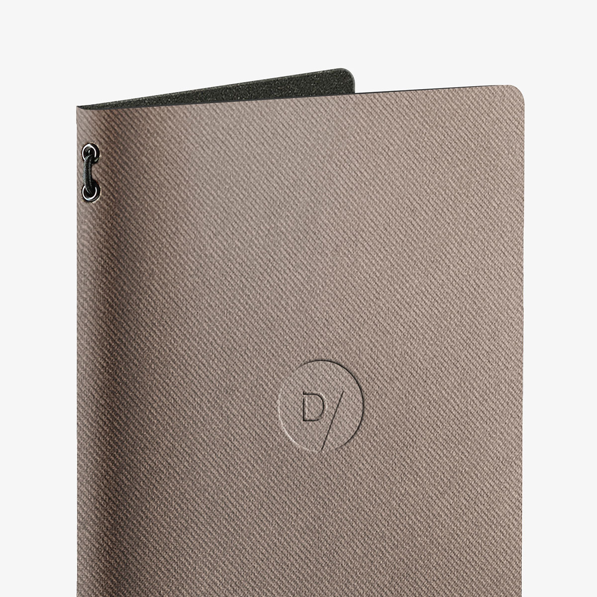 Disponible en trois formats et quatre coloris, avec système de fixation de feuilles à élastique ou avec cylindres en laiton pour pochettes en PVC (une paire de pochettes incluse pour insérer 2 feuilles imprimées recto/verso) et baguette en laiton et avec ou sans personnalisation par impression thermique de la marque sur le devant.