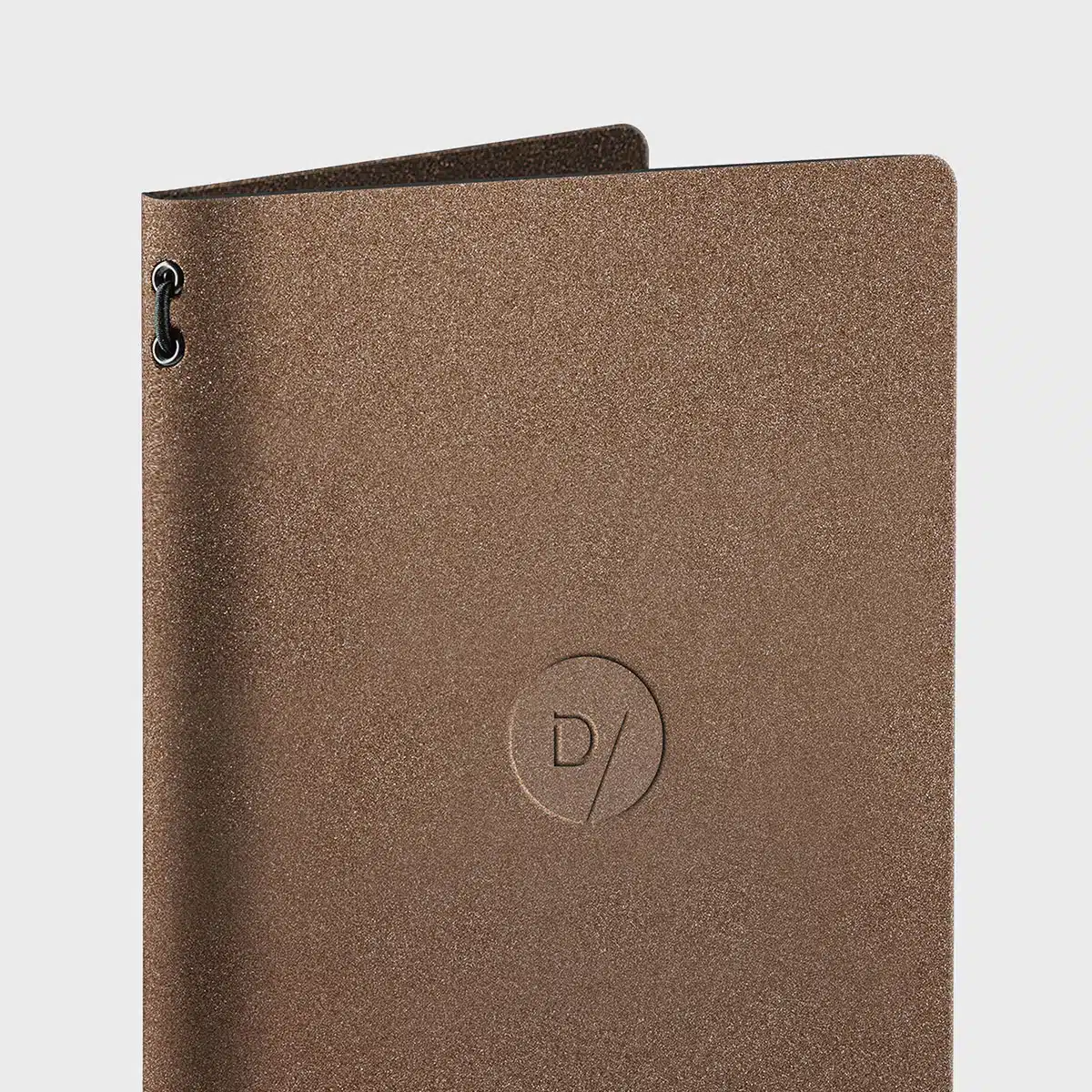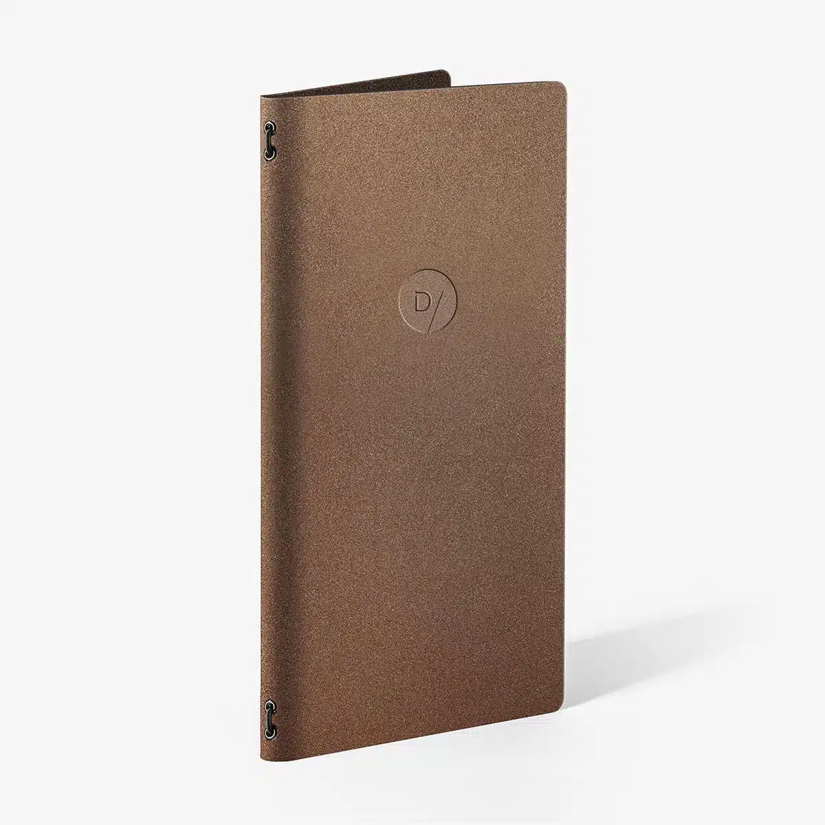 Disponible en trois formats et quatre coloris, avec système de fixation de feuilles à élastique ou avec cylindres en laiton pour pochettes en PVC (une paire de pochettes incluse pour insérer 2 feuilles imprimées recto/verso) et baguette en laiton et avec ou sans personnalisation par impression thermique de la marque sur le devant.