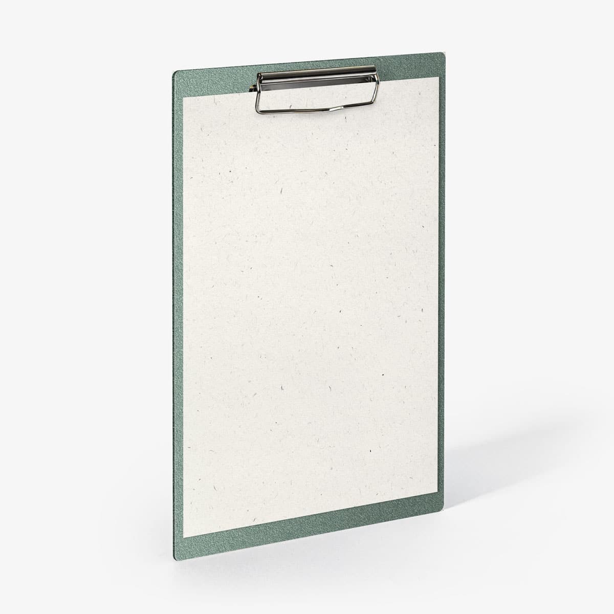 +iva /cadIl monopiatto Dedans in alluminio da 2 mm, verniciato a polvere in color Emerald, disponibile in tre formati con sistema fermafogli a pinza metallica rivettata.