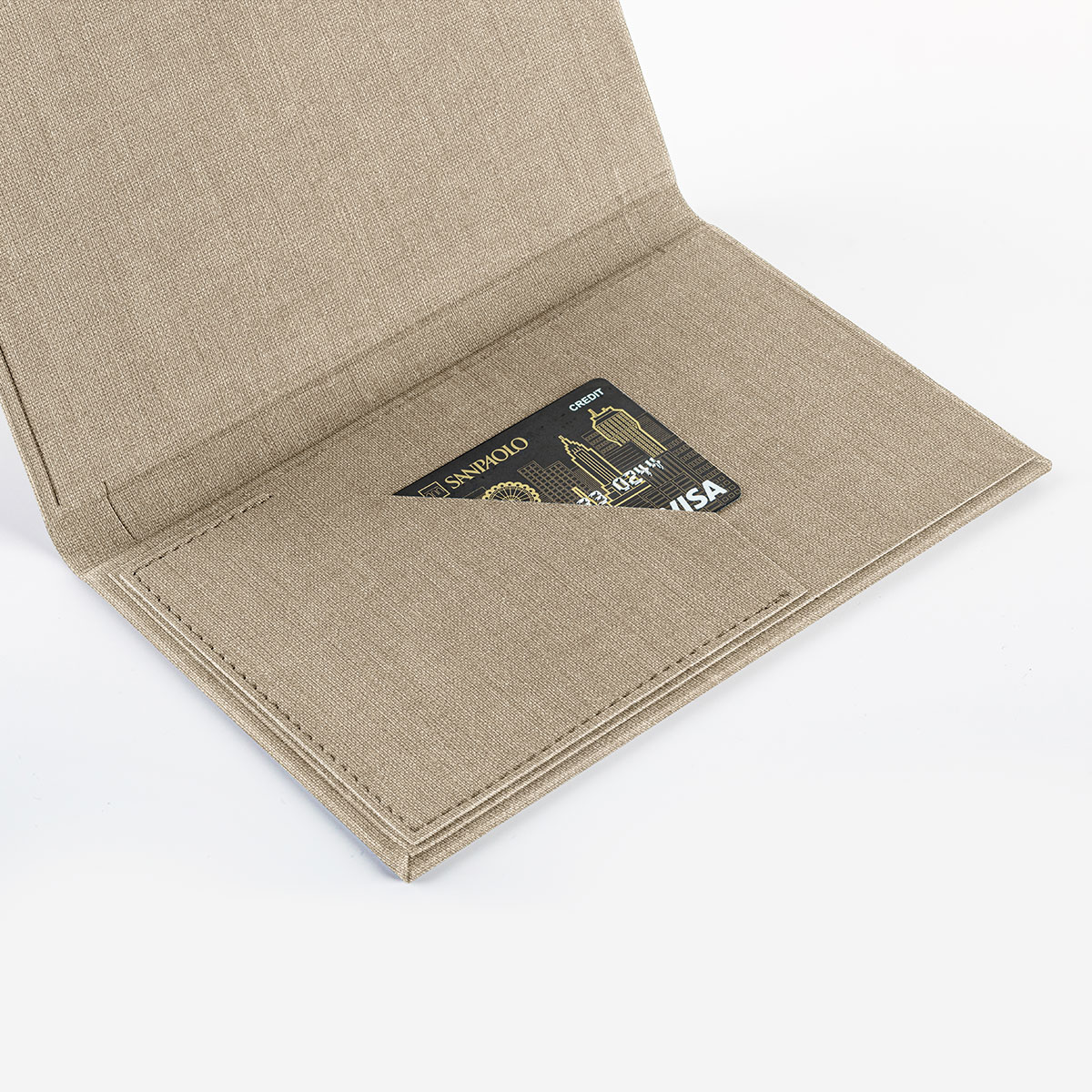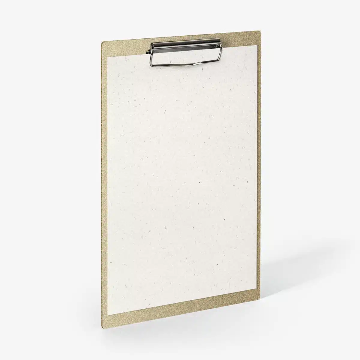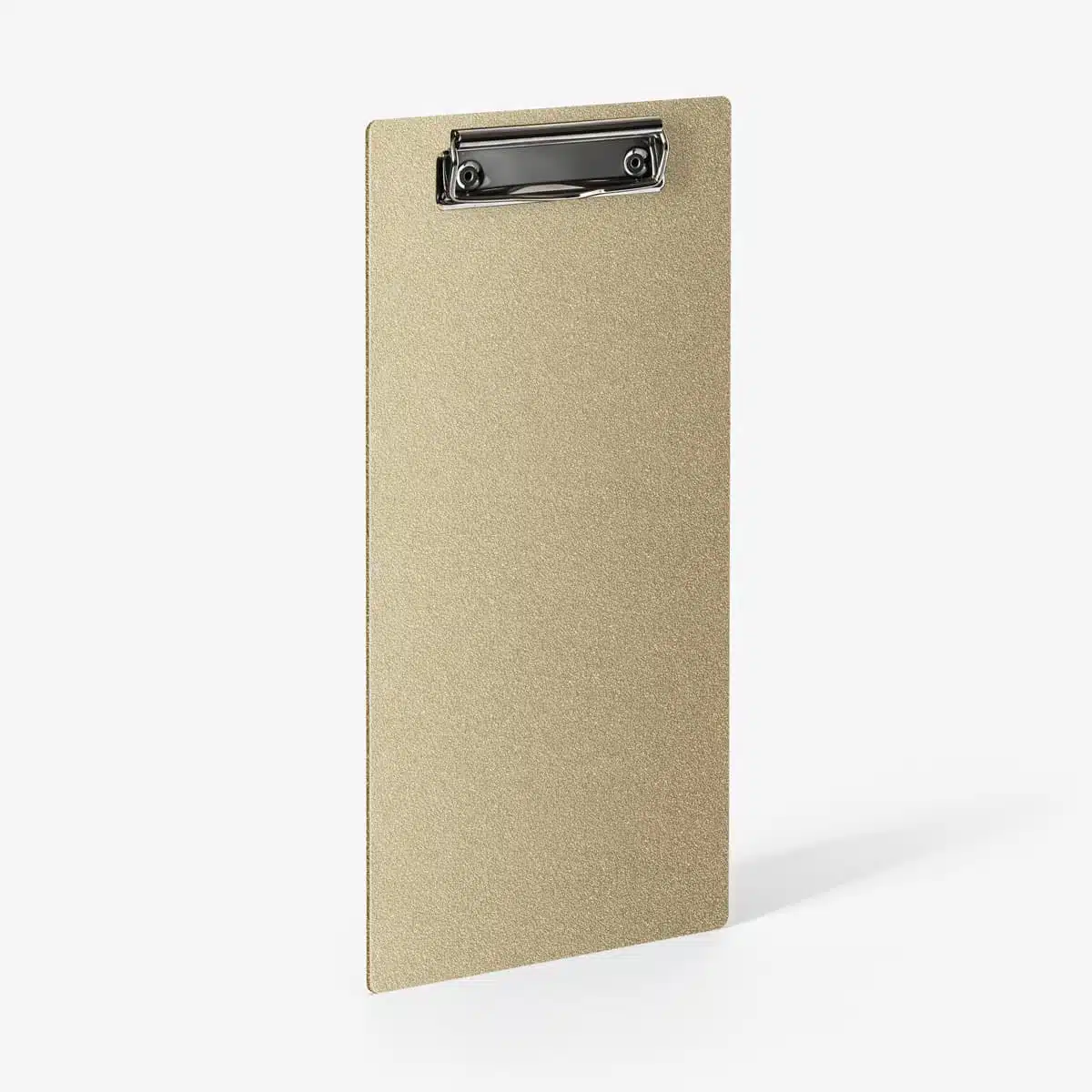 Il monopiatto Dedans in alluminio da 2 mm, verniciato a polvere in color Sabbia, disponibile in tre formati con sistema fermafogli a pinza metallica rivettata.