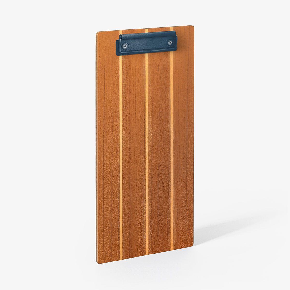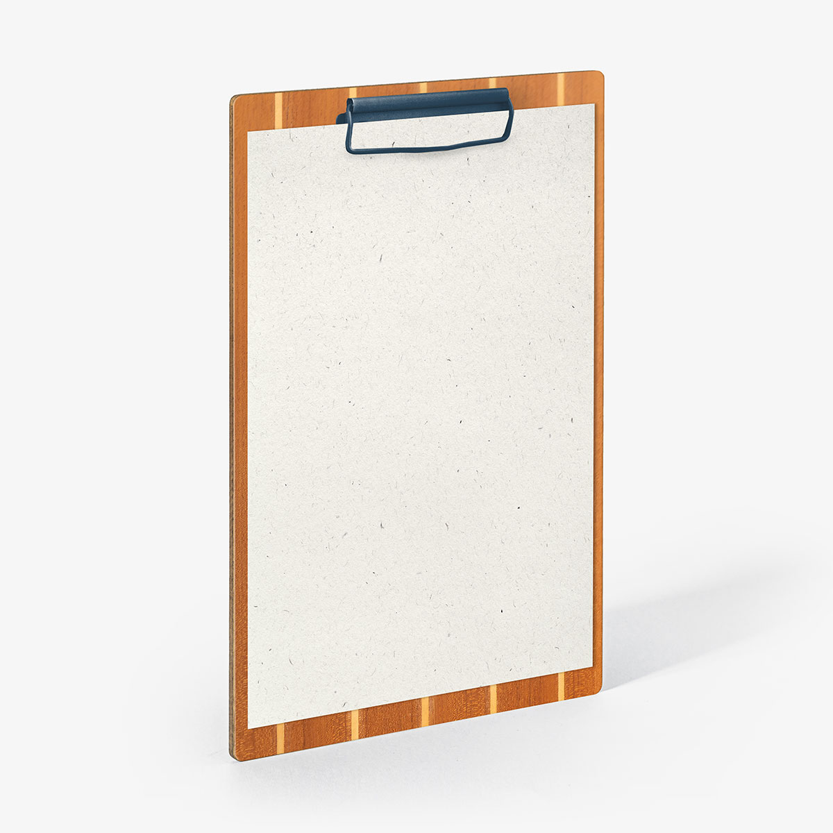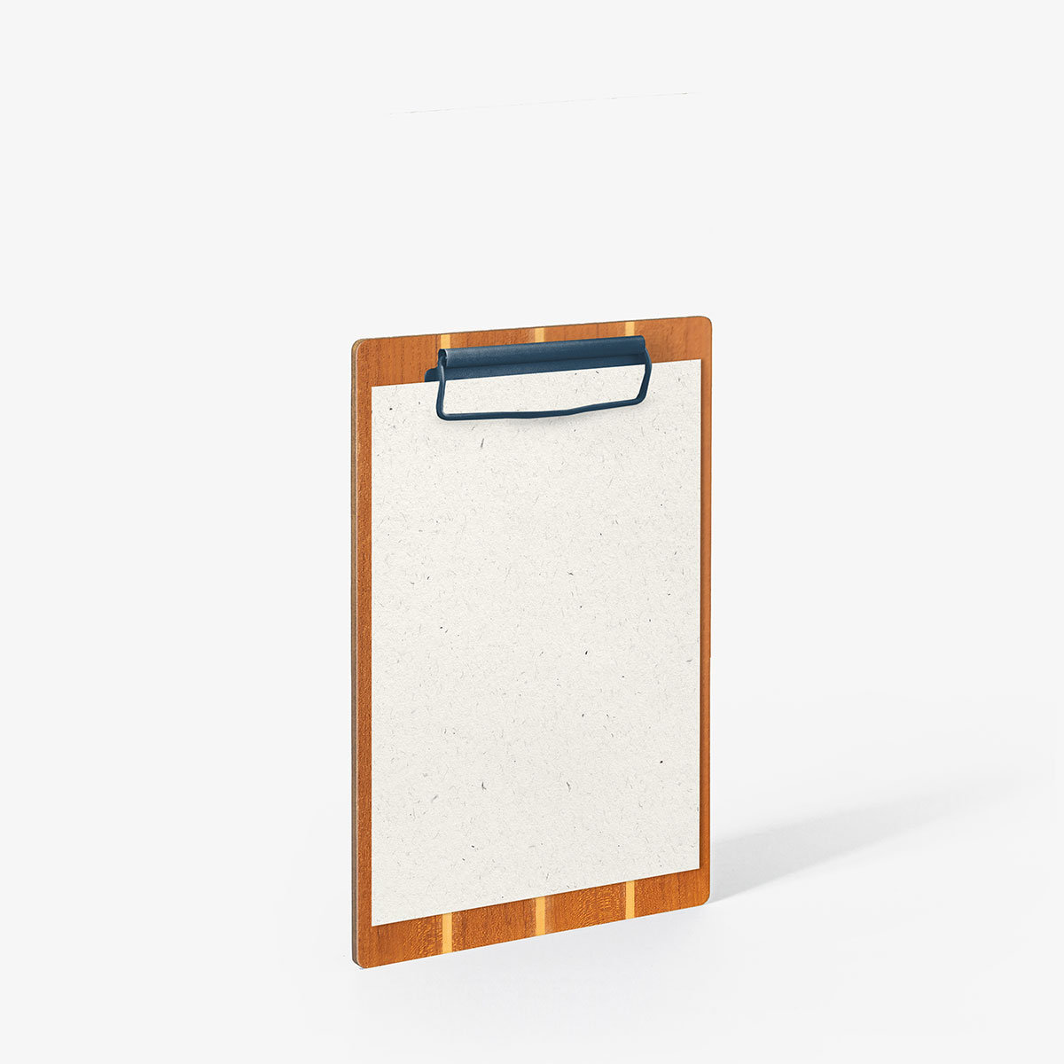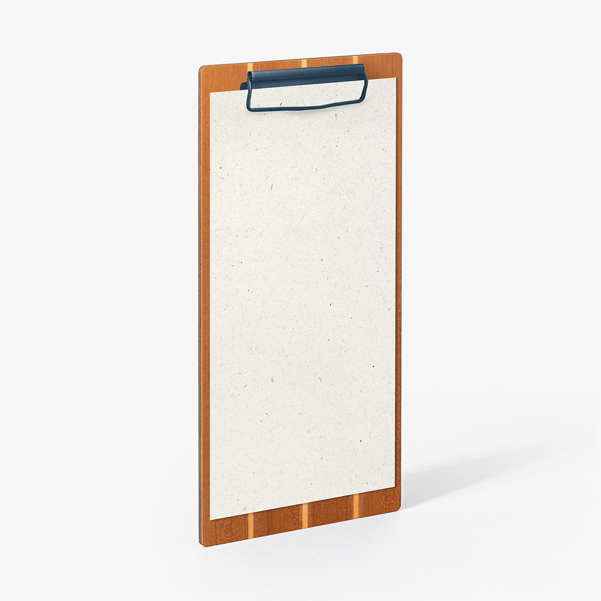 Disponibile in tre formati con sistema fermafogli a pinza metallica verniciata opaca color Oceanite rivettata e con o senza personalizzazione in stampa termica.