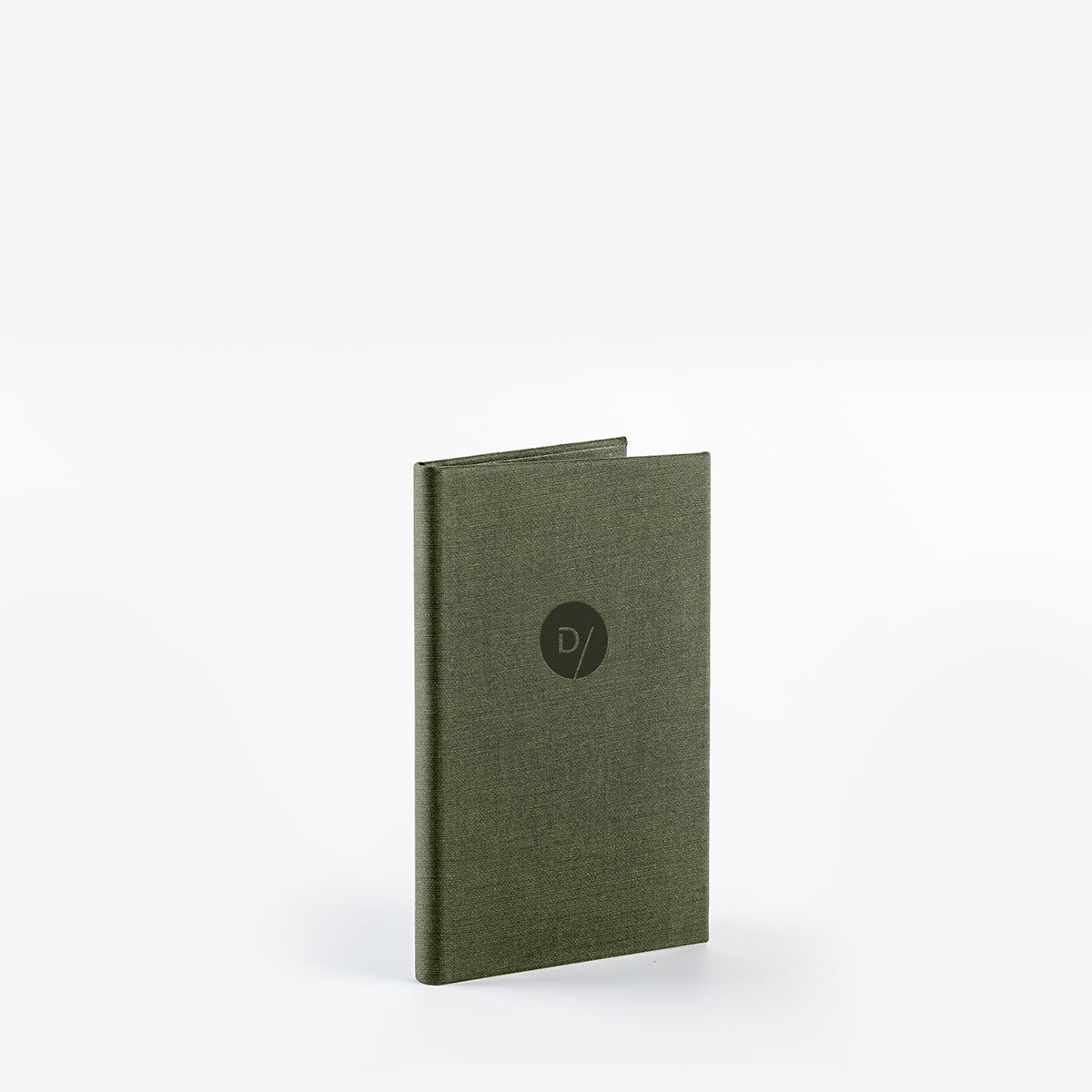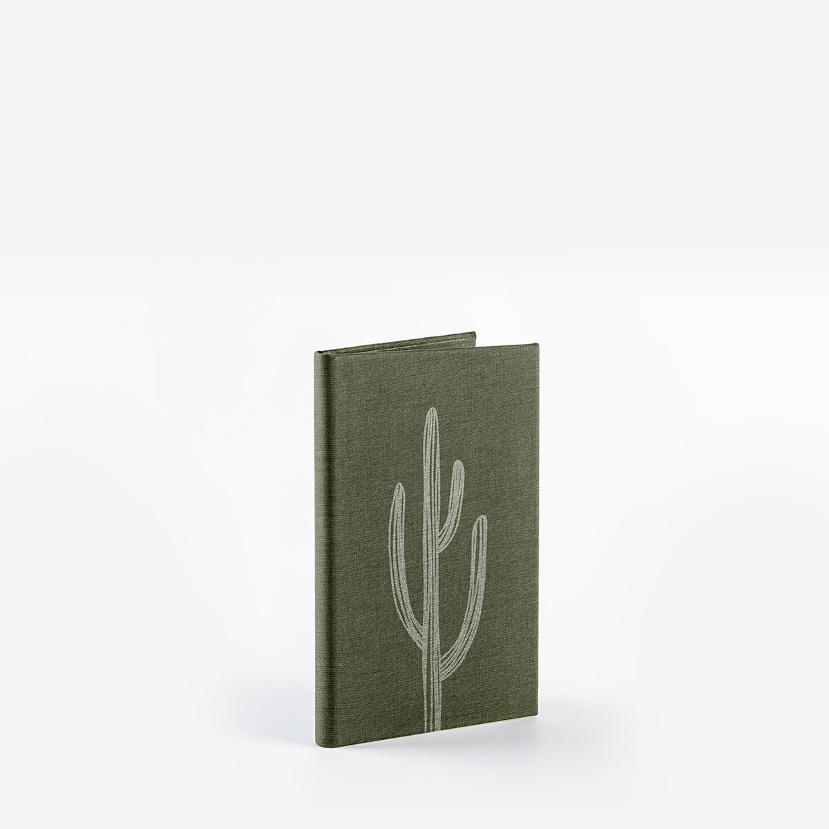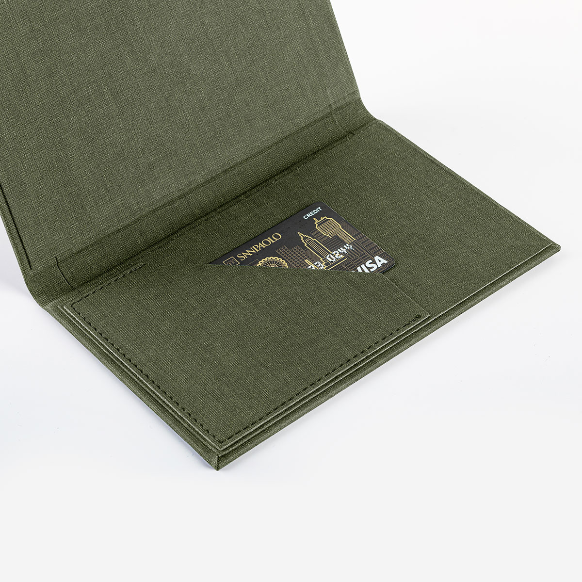 Portaconto a copertina rigida rimbordata realizzato in Tela Lino Cactus, una Tela spalmata dalla trama sottile effetto lino resistente allo sporco e all’acqua in viscosa certificata FSC 100%.