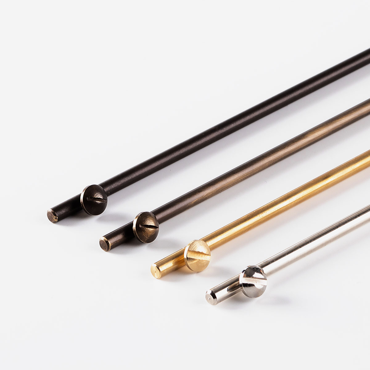 Disponibile in tre formati con sistema fermafogli ad elastico, cilindretti di ottone per buste in PVC o cartoncini plastificati (inclusi una coppia di buste o una coppia di cartoncini per inserire 4 facciate) e bacchetta in ottone in quattro finiture a scelta.