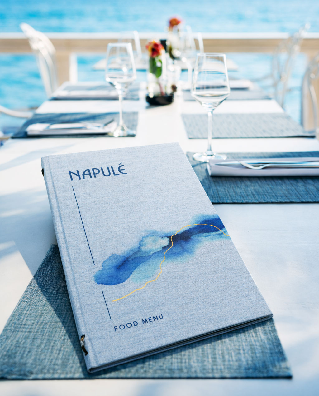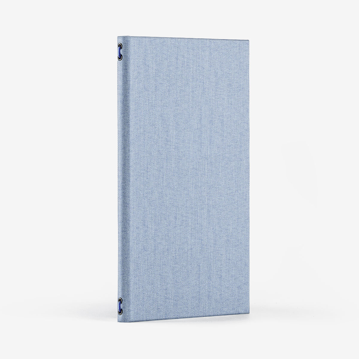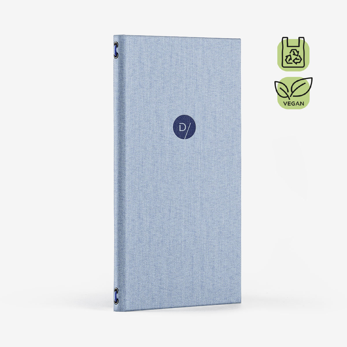 +iva /cadPortamenù Canvas a copertina rigida rimbordata realizzato in Tela Ocean Eco azzurro Ciel, una tela vegan realizzata per il 55% con un filato ottenuto dal recupero della plastica negli oceani. La tela esterna è resistente ad acqua e grassi e lavabile con detergenti non aggressivi.