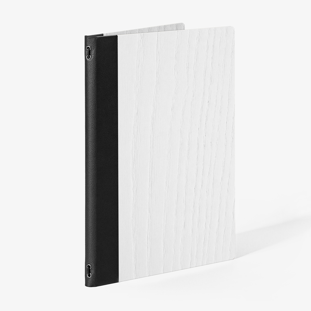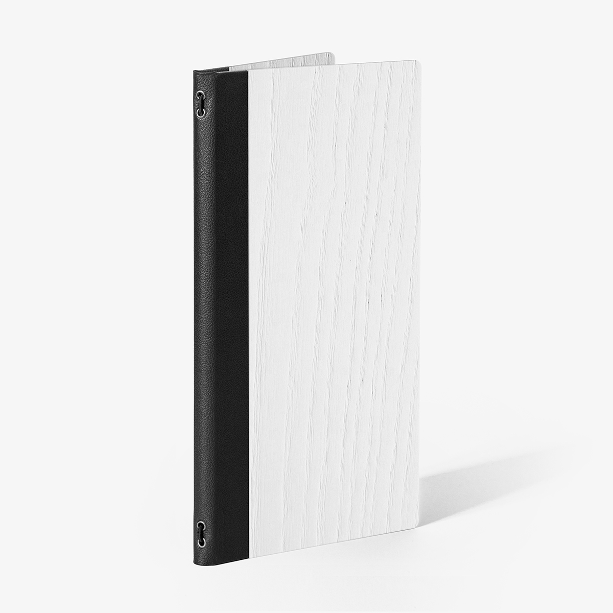 +iva /cadPortamenu in vero legno di Frassino laccato bianco con verniciatura protettiva trasparente super-opaca e dorso in similpelle Nabuk Nero. La superficie è impermeabilizzata e trattata per resistere all’invecchiamento da UV, macchie e igienizzazioni.